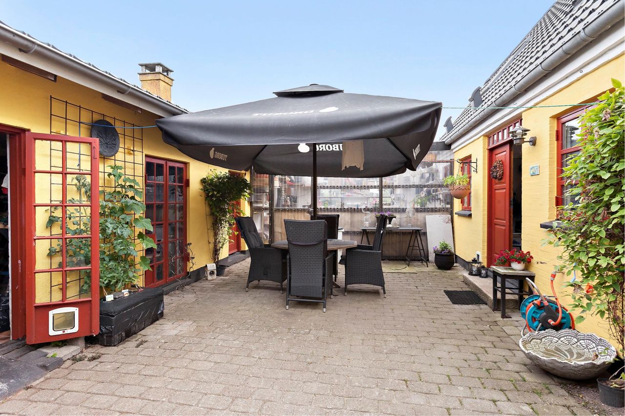lukket gårdhave, hvor I kan sidde og nyde fuglenes skønsang – og fra tid til anden endda