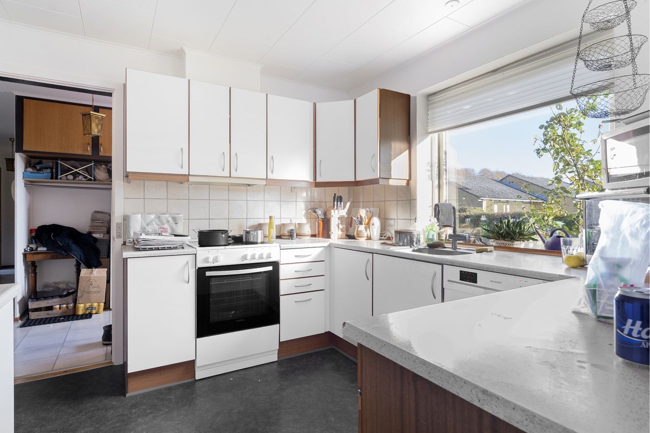 Boligen er indrettet med en entré/fordelergang. Køkkenet og alrummet er kombineret med stuen, hvilket